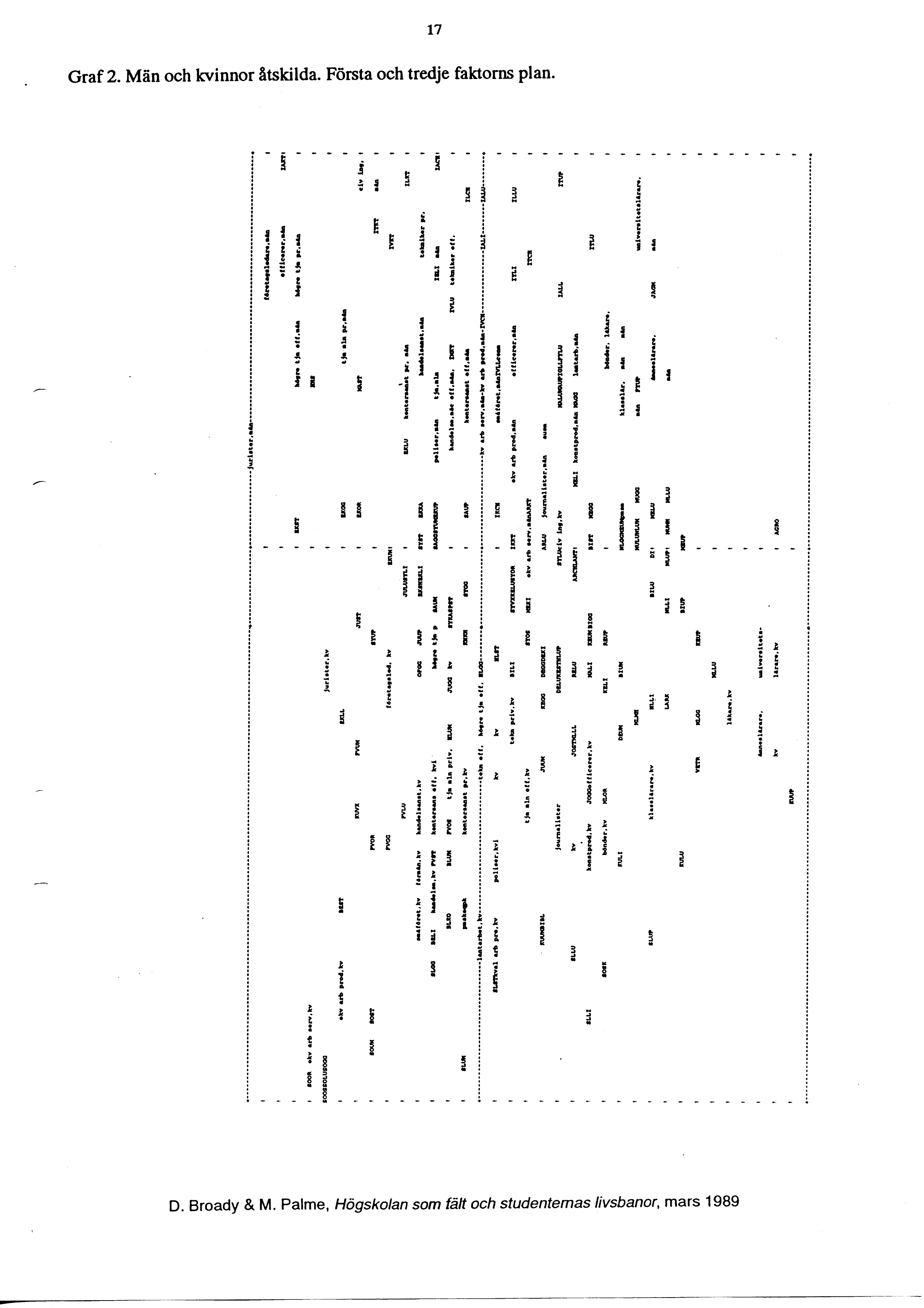 Så långt kommentaren till graf 3. I appendixet återfinns ytterligare två kartor (graf 1 och graf 2), som visar resultatet av analyser där vi skiljt mellan manliga och kvinnliga studerande. Därmed har antalet grupper fördubblats, så att vi erhåller 64 grupper: döttrar till civilingenjörer, söner till civilingenjörer, döttrar till läkare etc. Graf 1 visar första och andra faktorns plan, graf 2 visar första och tredje faktorns plan.