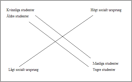Tillfogas bör, att strukturen även rymmer en ålderdimension. Motsvarande analyser (vars grafer ej är återgivna här) där även olika åldersgrupper tagits med som modaliteter visar på en fördelning av äldre och yngre studenter som är helt parallell med fördelningen kvinnor/män. Om vi väljer att låta såväl kön som ålder som socialt ursprung vara fristående variabler erhåller vi en kiastisk struktur av följande utseende.